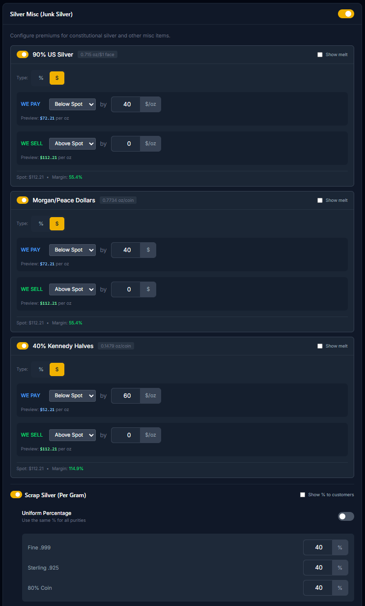 - •Admin panel for setting buy/sell premiums by product
