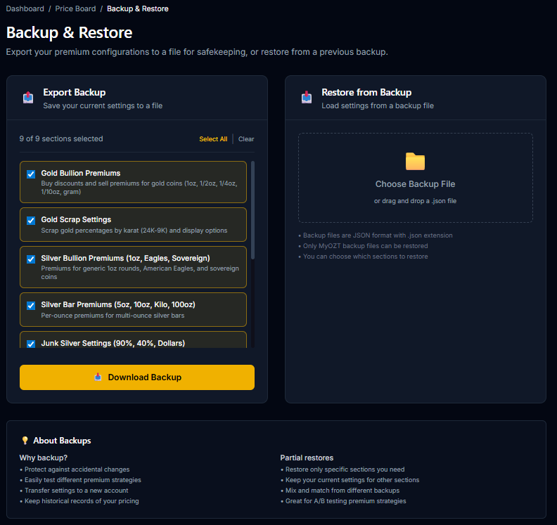 MyOZT is a dealer-focused precious metals price board designed for coin shops and bullion dealers. Built with Next.js 15 and PostgreSQL, it displays real-time spot prices for gold, silver, platinum, and palladium while giving dealers full control over premiums and inventory.